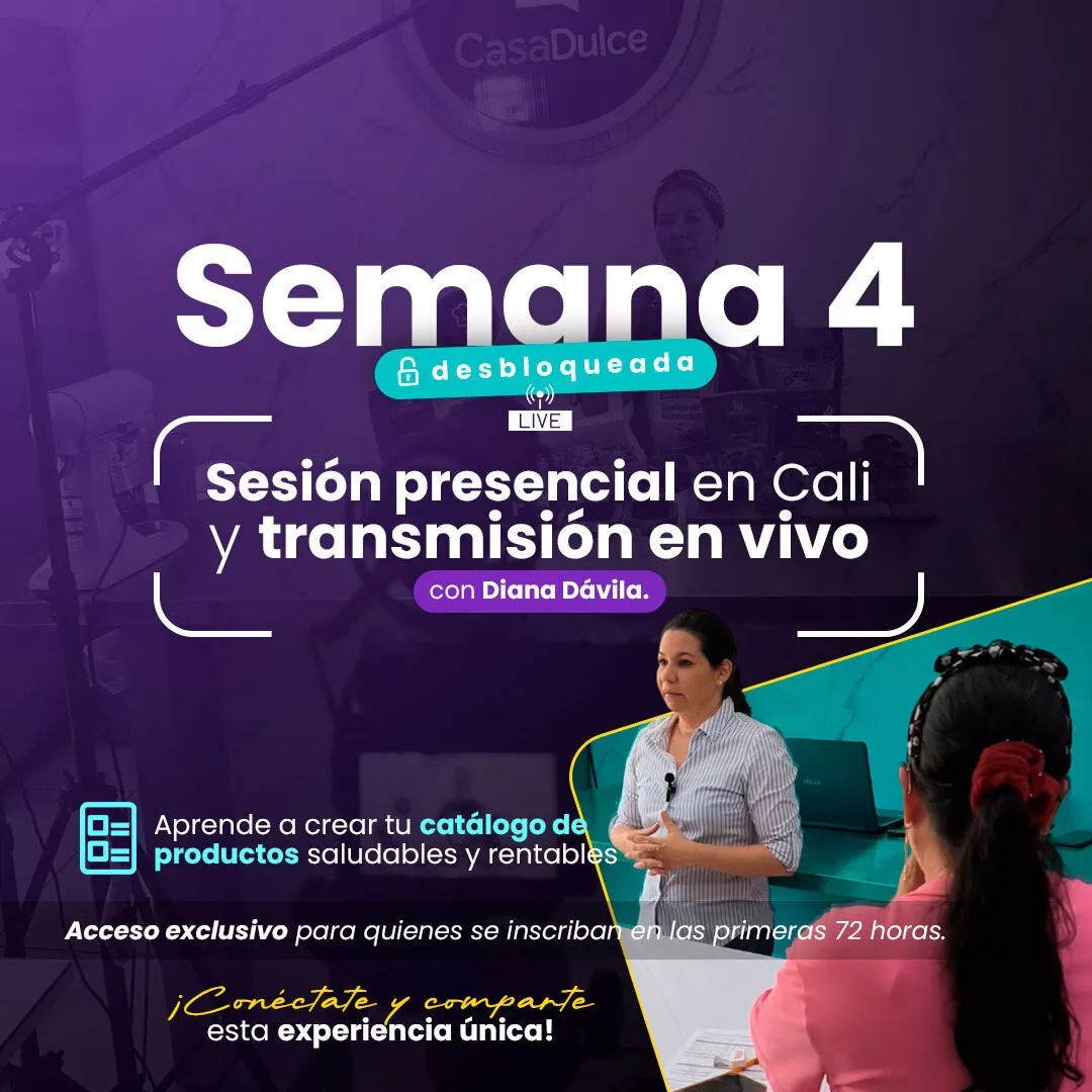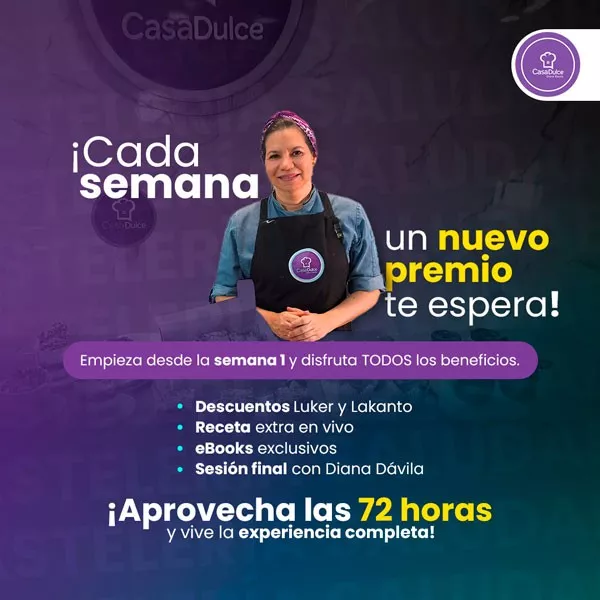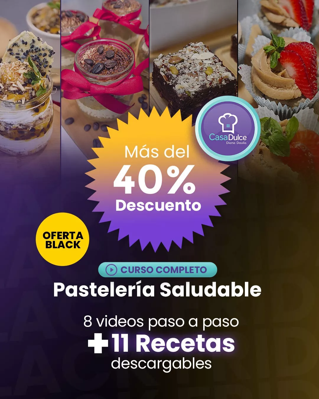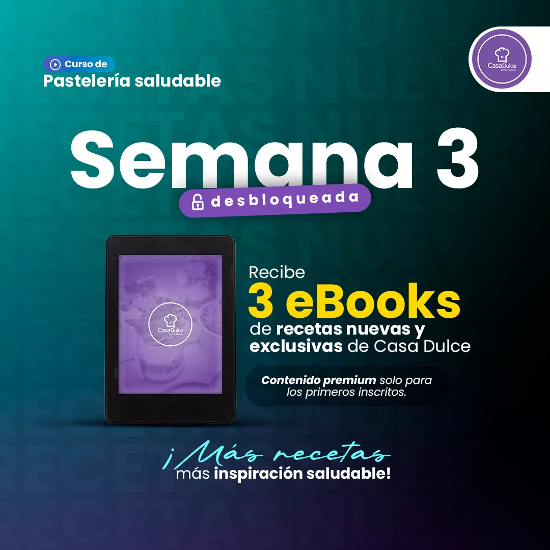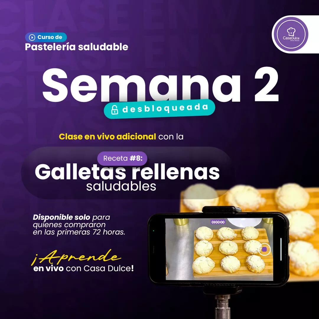 4 recetas exclusivas pregrabadas + 3 clases en vivo donde aprenderás técnicas avanzadas de pastelería saludable paso a paso.